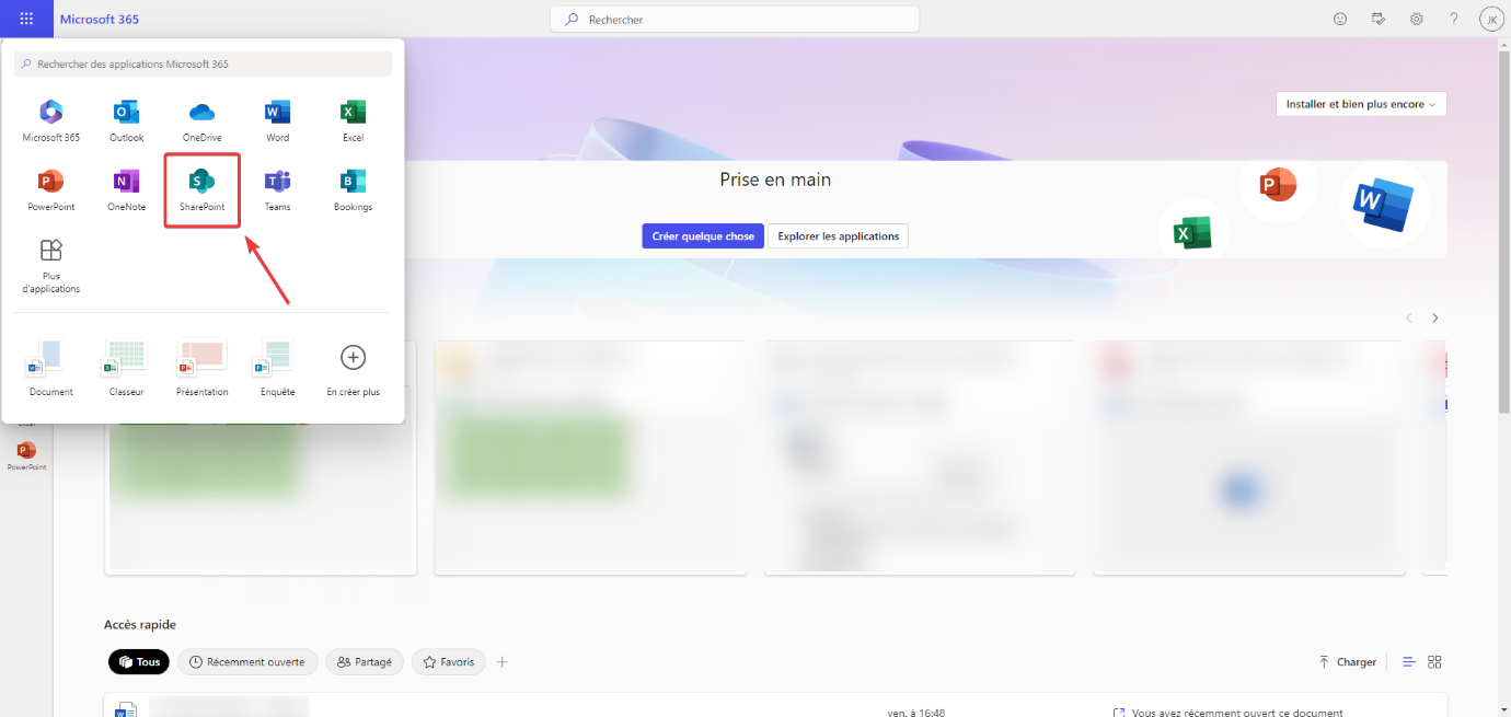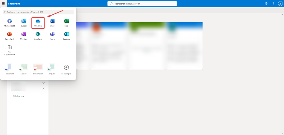 4 - Cliquez de nouveau sur les petits points dans le coin gauche à côté de « SharePoint » puis cliquez sur « OneDrive ».