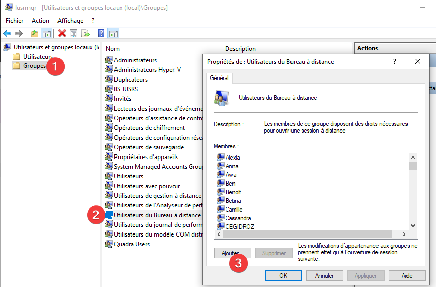 - Ajoutez l'utilisateur dans le groupe Utilisateurs du bureau à distance.