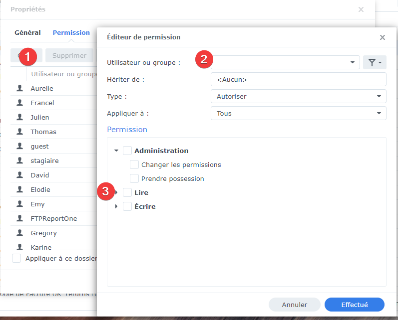 - Ajoutez l'utilisateur concerné avec des droits de Lecture et Écriture.